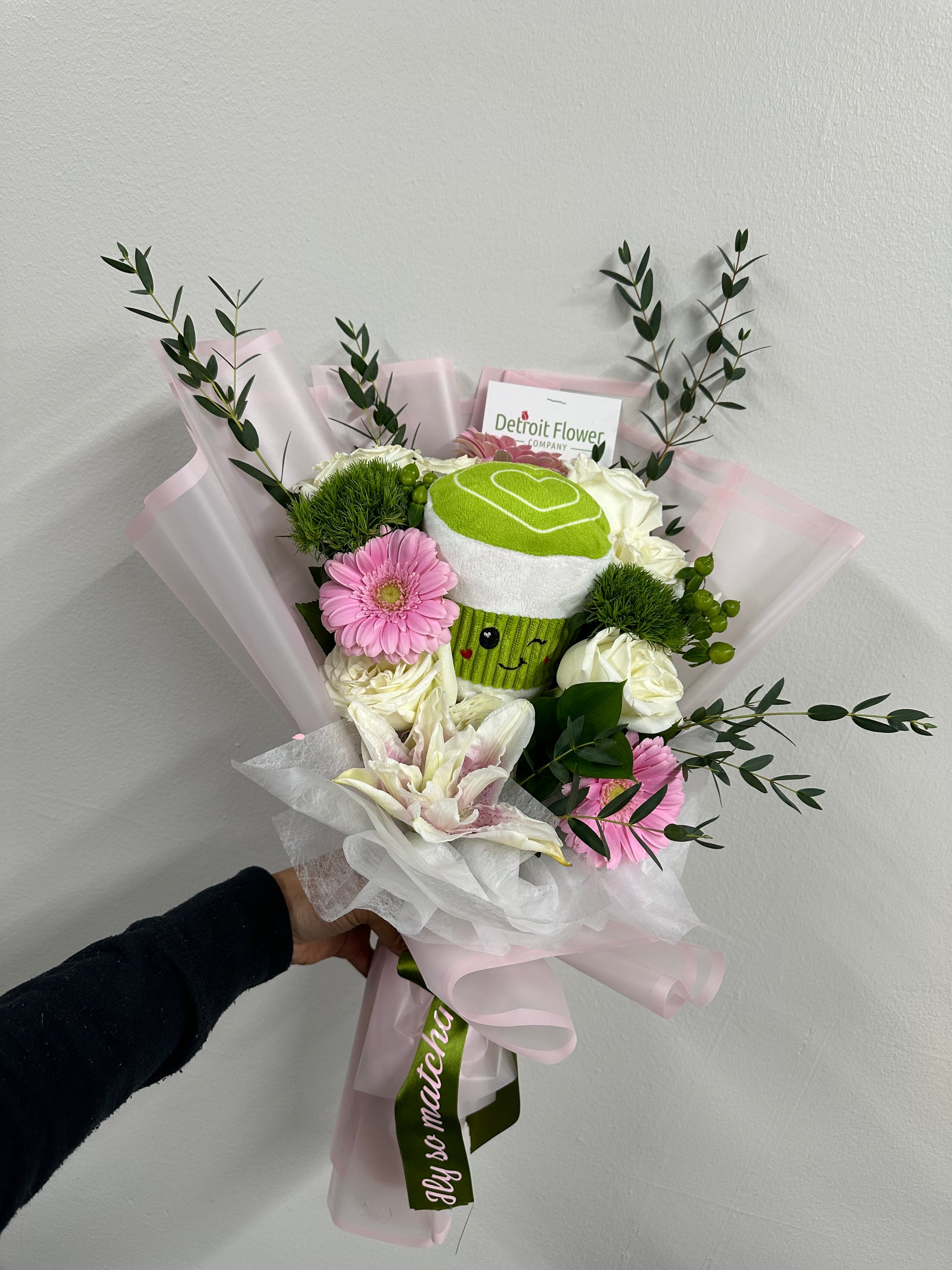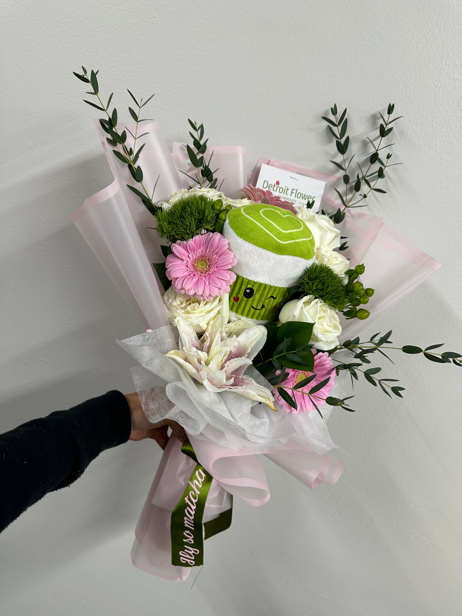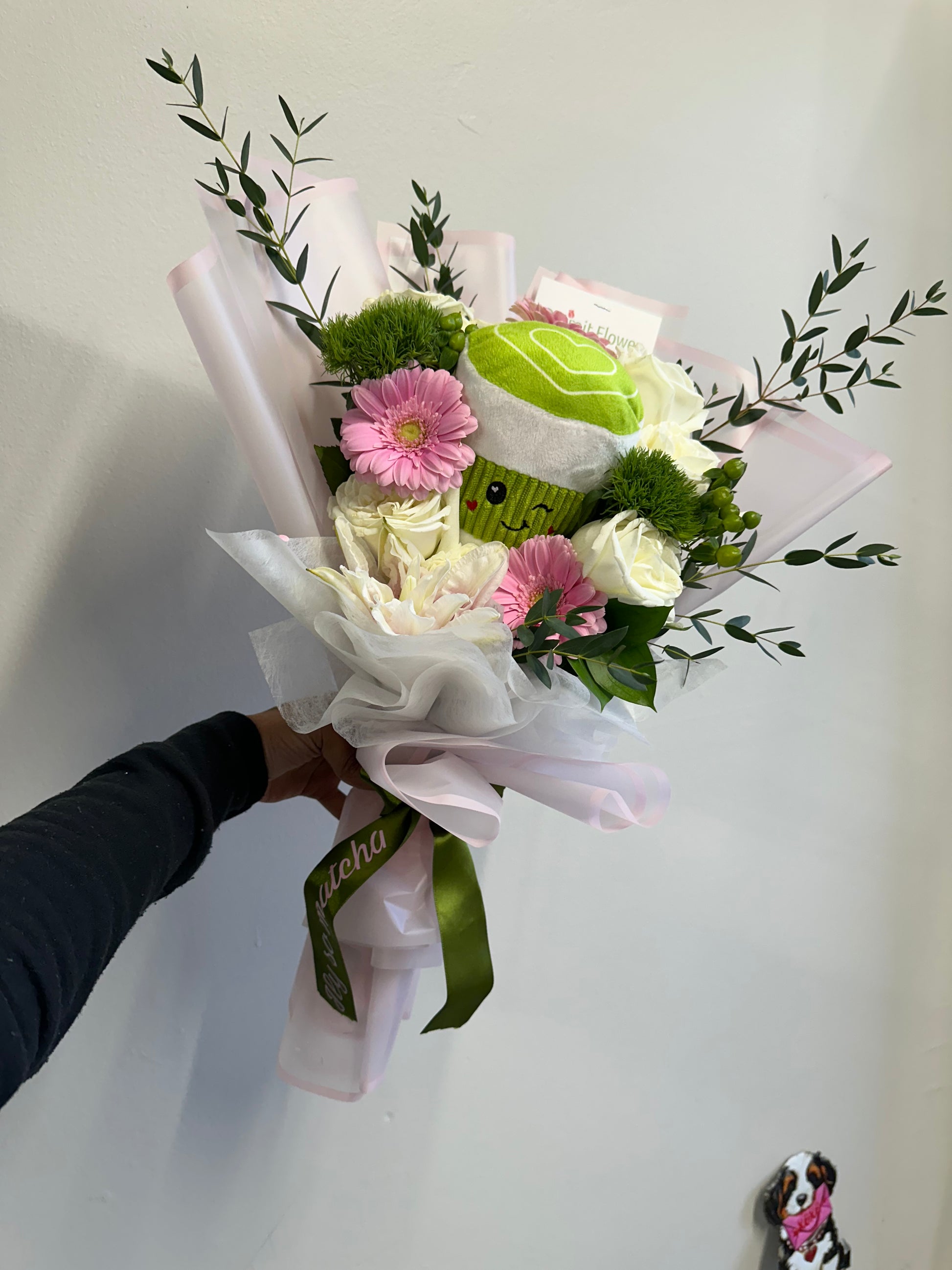 A sweet matcha-inspired bouquet featuring 6 white roses paired with soft pink and seasonal greenery. Finished with a tissue rim, a cozy matcha plush, and our signature “ILY so matcha” ribbon for the perfect little love moment.
