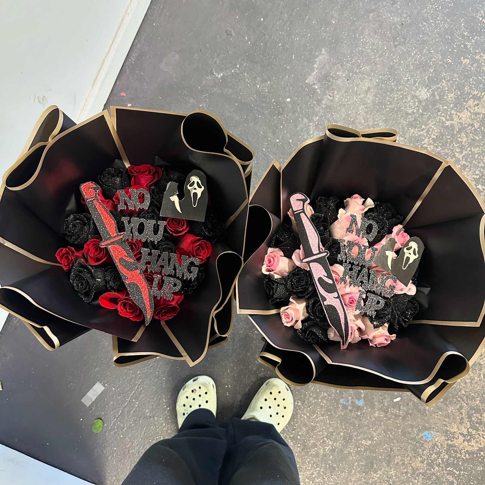 Topped with the playful yet eerie phrase “No You Hang Up First”, the bouquet is completed with a glitter Scream knife accent, creating the perfect mix of horror, glam, and love. Ideal for spooky season surprises, horror fans, or anyone who loves their romance with a dark twist.