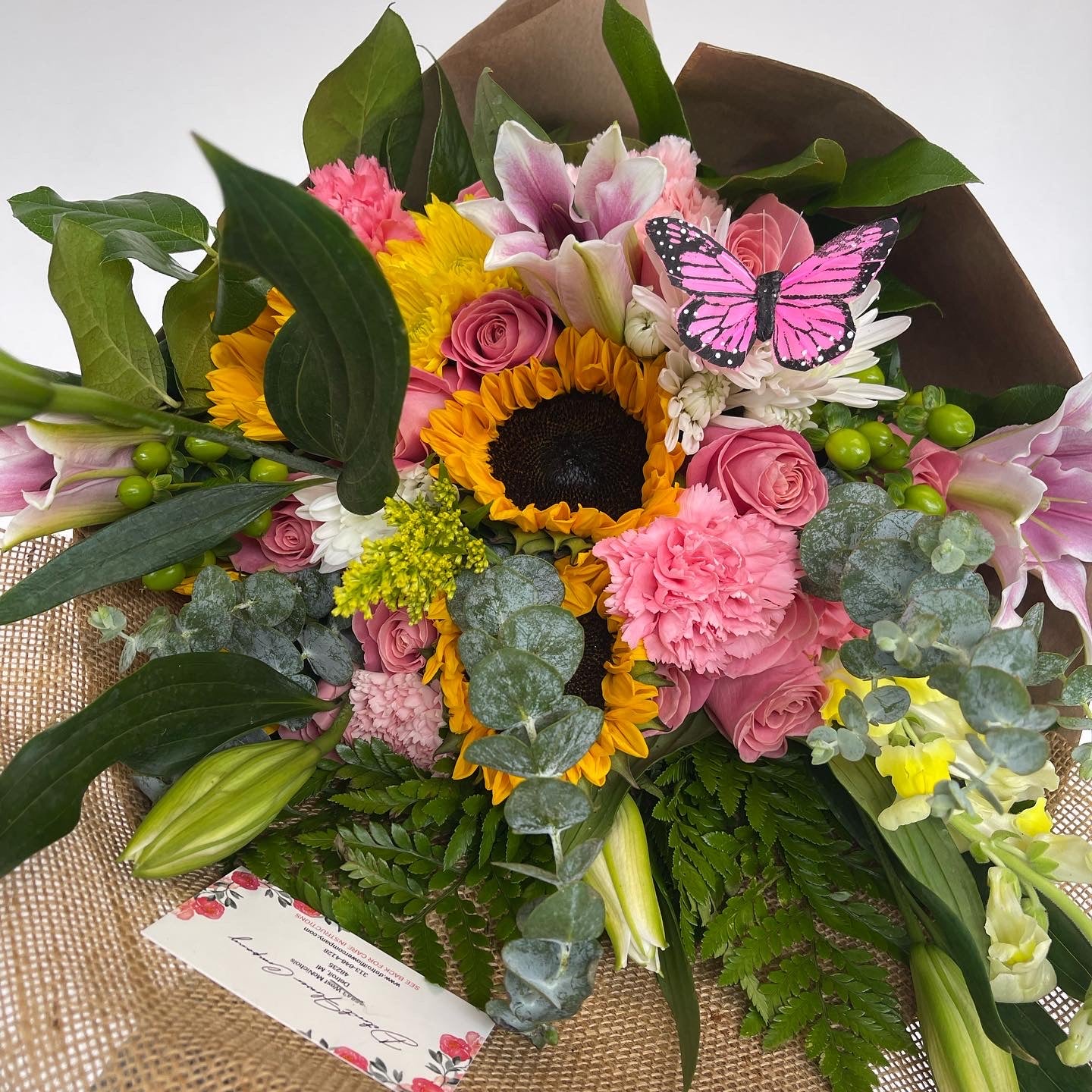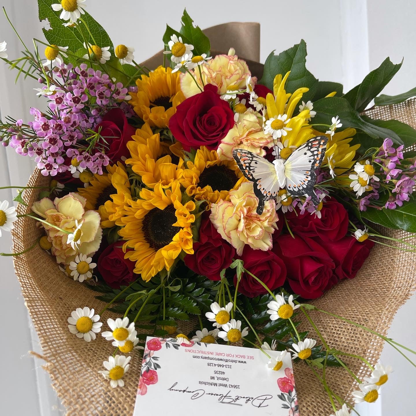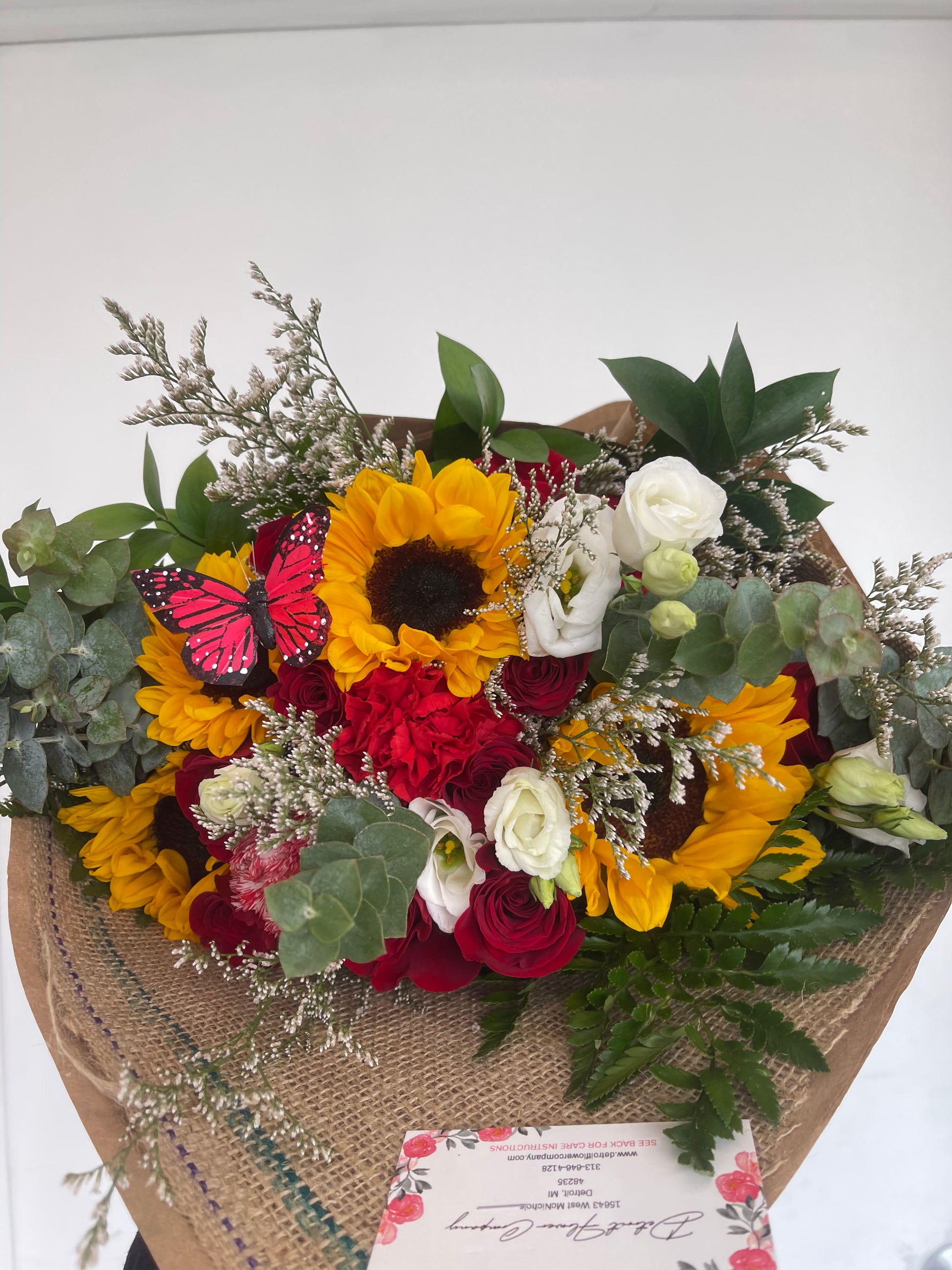 Our sunflower and rose bouquet is truly something to brighten someone’s day! (ROSES SOLD PER DOZEN, SUNFLOWERS SOLD PER BUNCH Roses of your choice, includes flower food, arrive alive water pack, personalized card message and fillers and special greenery! Fillers are seasonal! Care package is on the back of the business card.