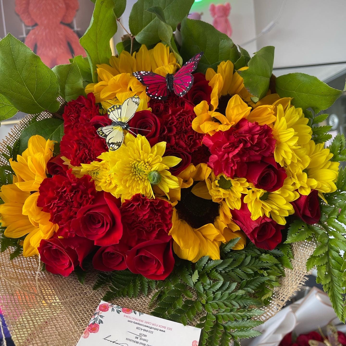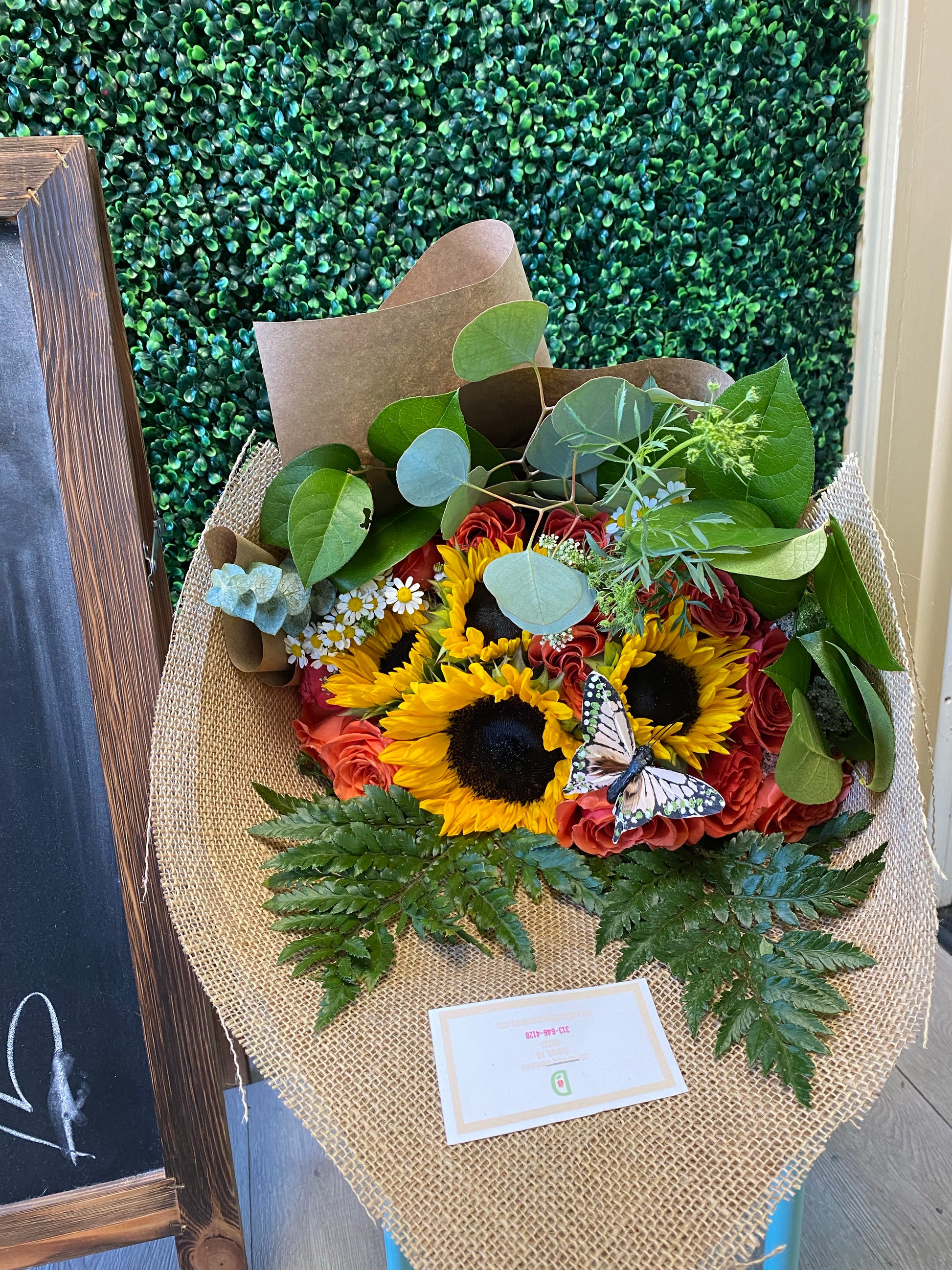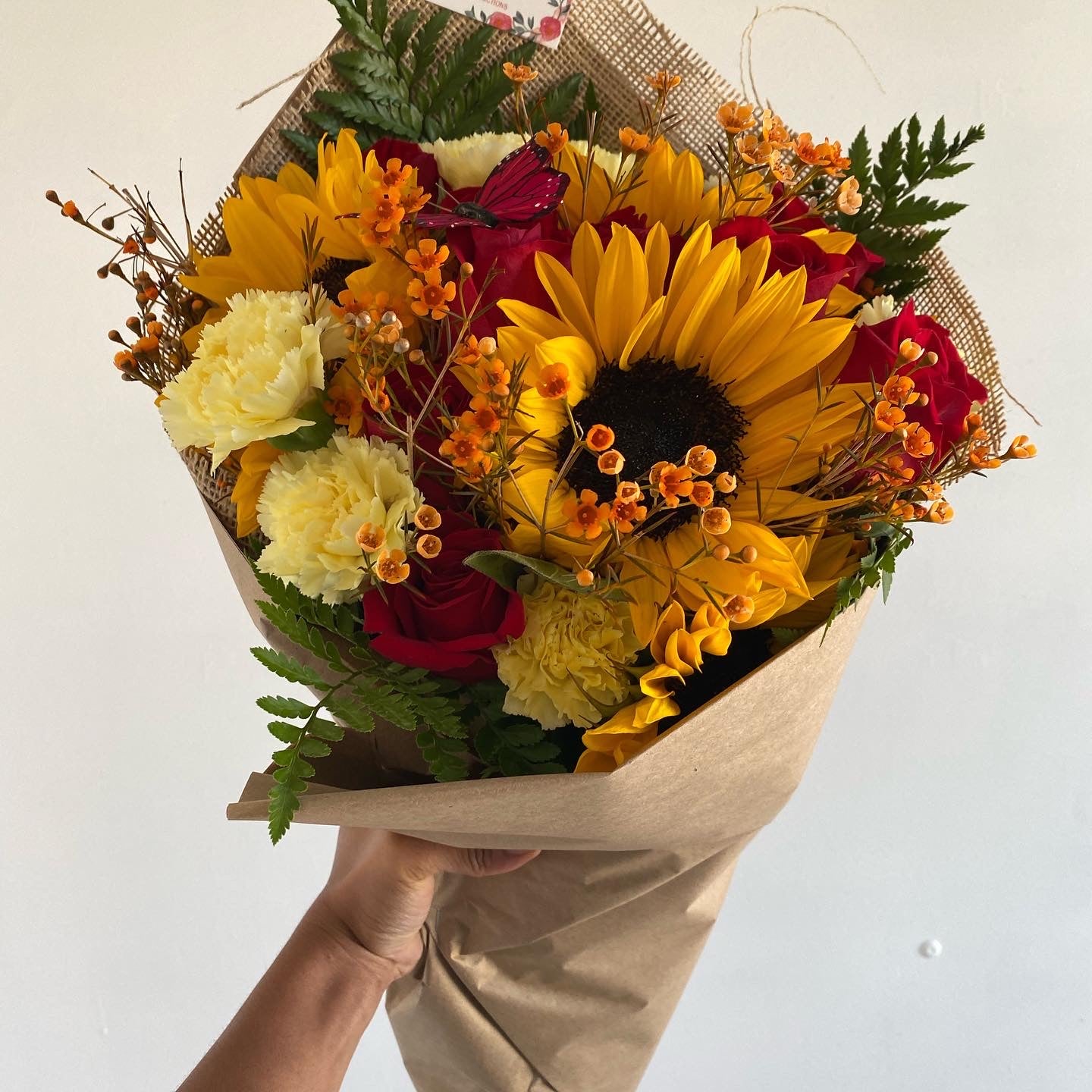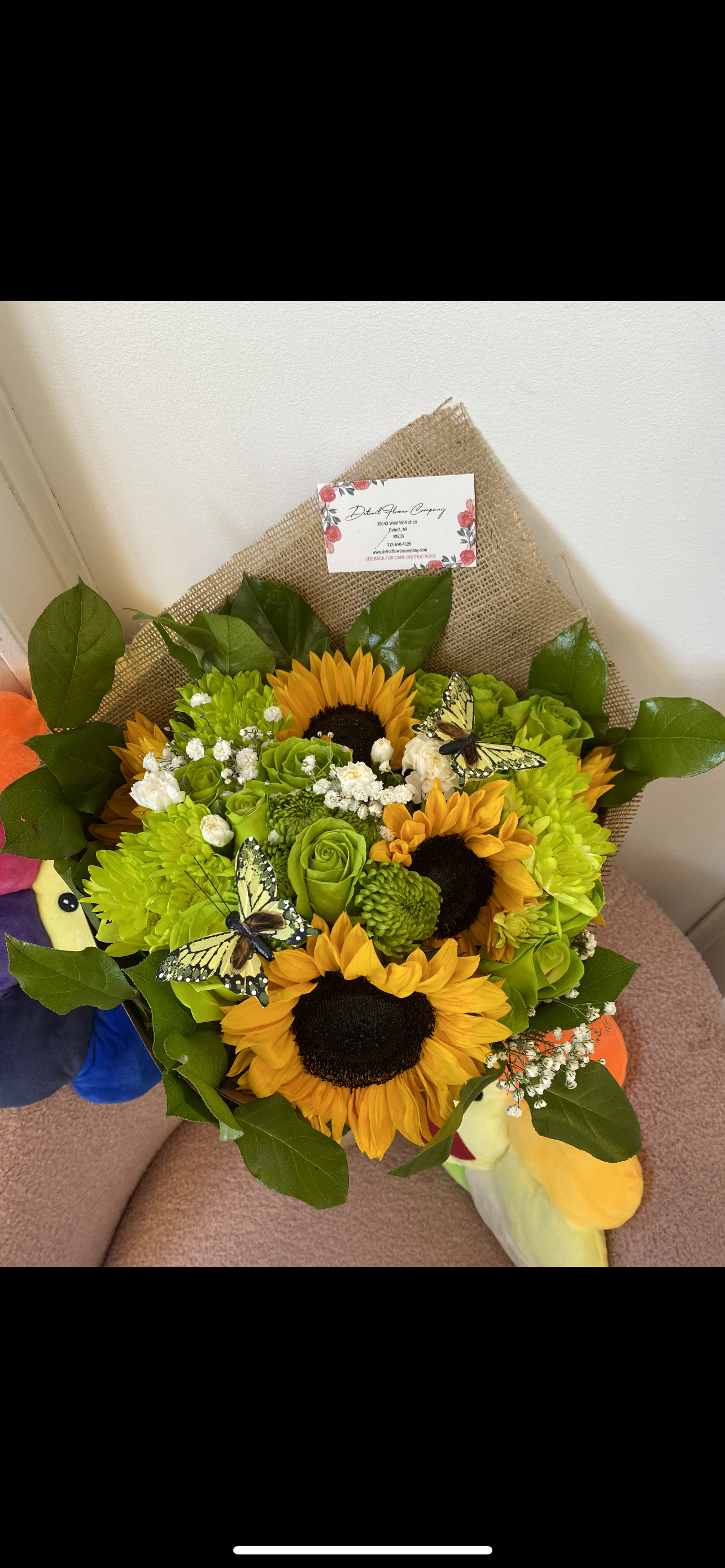 Our sunflower and rose bouquet is truly something to brighten someone’s day! (ROSES SOLD PER DOZEN, SUNFLOWERS SOLD PER BUNCH Roses of your choice, includes flower food, arrive alive water pack, personalized card message and fillers and special greenery! Fillers are seasonal! Care package is on the back of the business card.