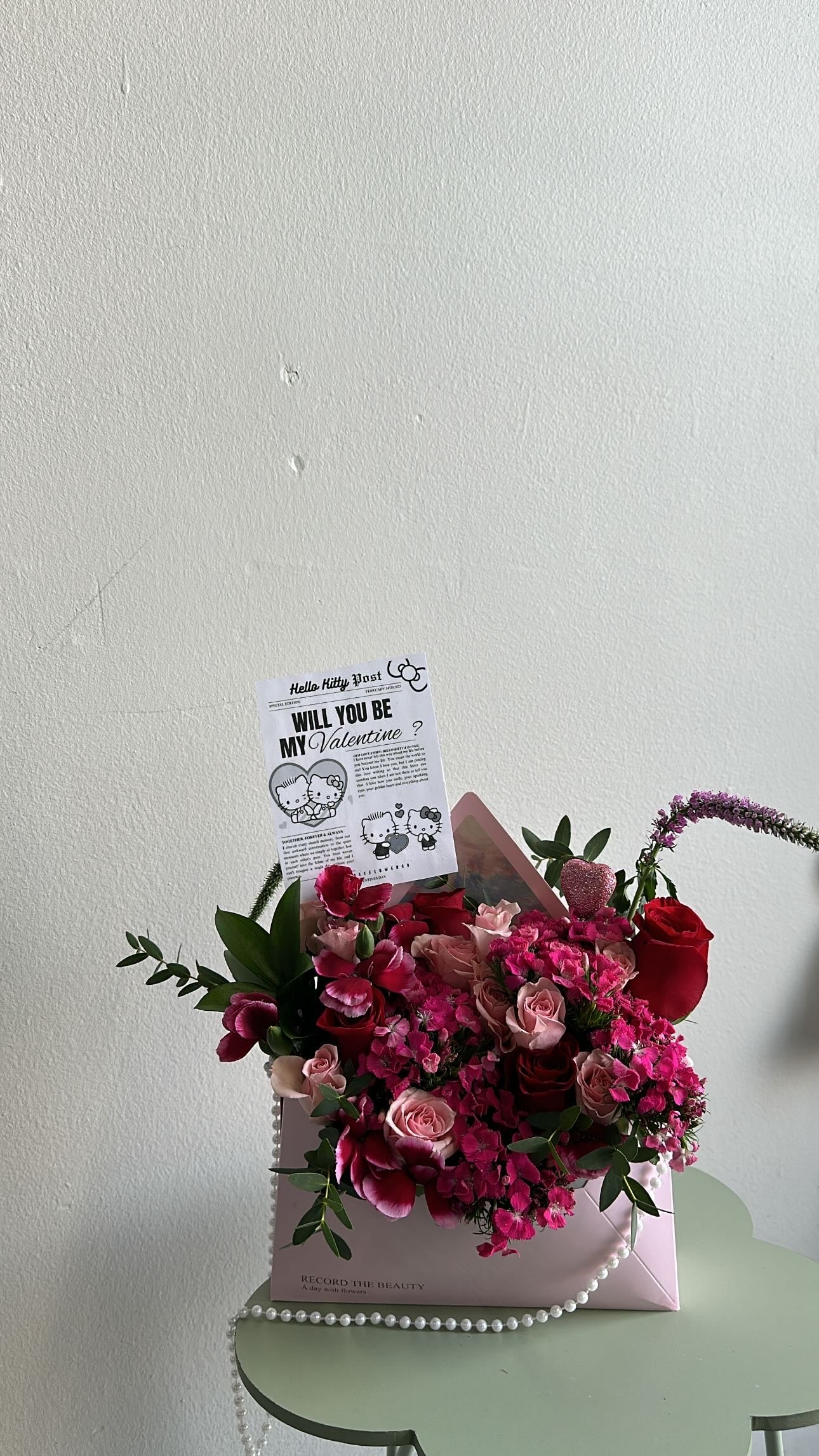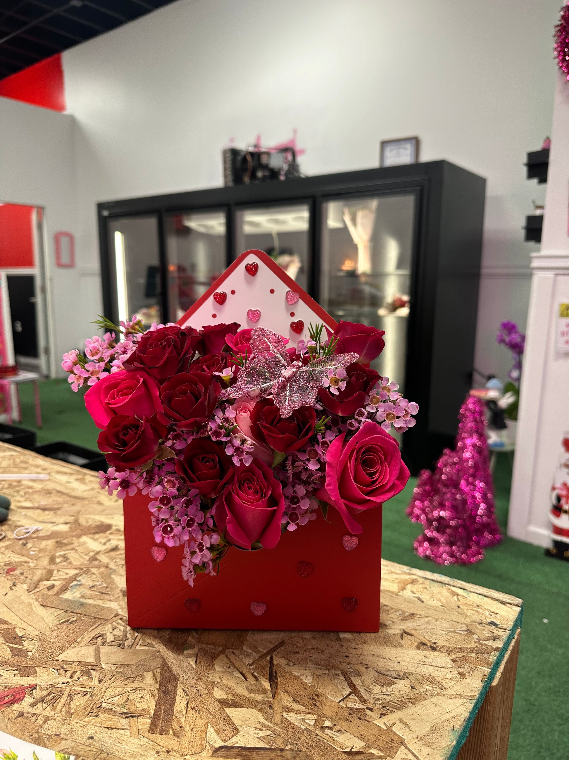 This envelope shaped floral arrangement features premium roses, delicate spray roses, and lush filler flowers artfully designed to resemble a love letter. Finished with assorted Valentine’s Day picks and festive accessories, this piece is the perfect way to deliver your message of love.